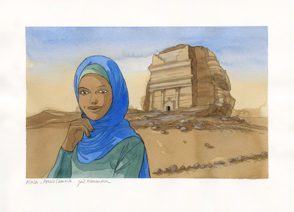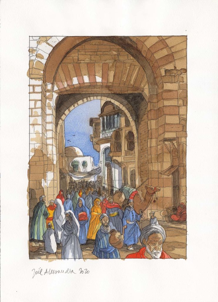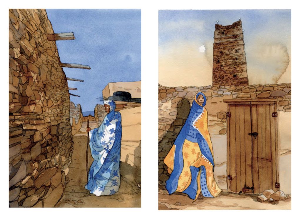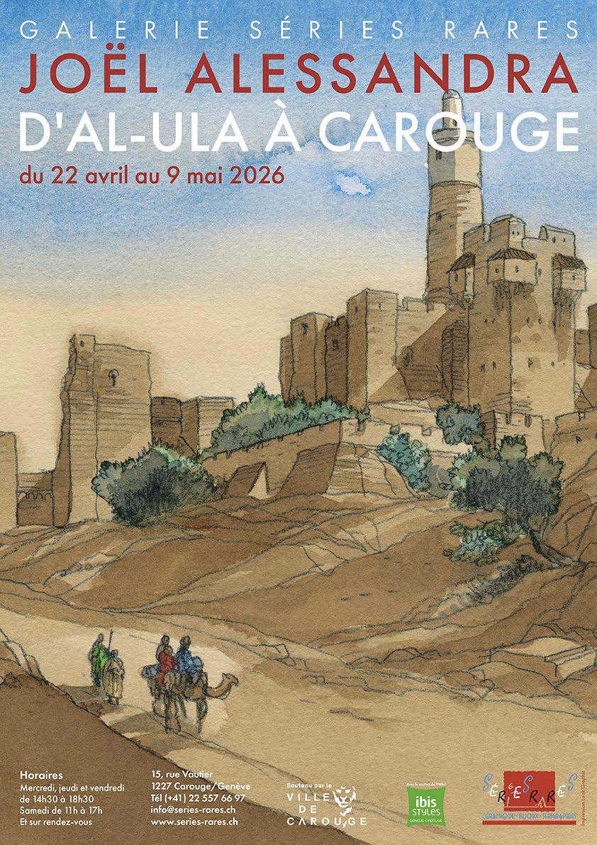 Grand voyageur devant l’éternel, Joël Alessandra remplit de ses croquis carnets sur carnets, que ce soit pour la réalisation d’une bande dessinée ou celle d’un album comme celui, tout frais édité, qui sert de prétexte à cette exposition, Déserts, dans l’infini des extrêmes. On y trouve tout un foisonnement de dessins pris sur le vif ou réalisés (avec un peu de recul et à partir de notes ou de photos) en atelier, au gré de trente ans de pérégrinations à travers le Tchad, l’Arabie saoudite et la Mauritanie. Non seulement un certain nombre de dessins issus de ce livre seront présentés, mais aussi un grand nombre d’originaux (près de quarante) de la magnifique bande dessinée Les Voyages d’Ibn Battûta. De nombreux dessins réalisés pour Je est un autre, La Force des femmes ou d’autres ouvrages figureront également au programme.